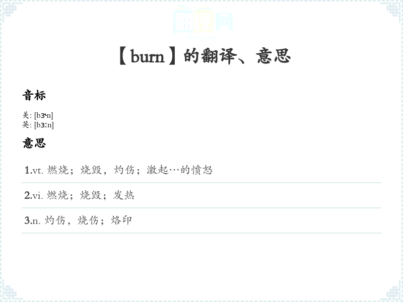 1.vt. 燃烧;烧毁,灼伤;激起…的愤怒