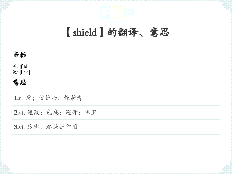 3.vi. 防御;起保护作用 4.n. (Shield)人名;(英)希尔德