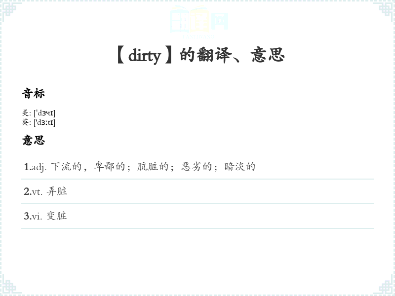 - 字面意思:字面上,“dirty”指的是不干净的状态,通常用来描述物体、环境或人的外观。