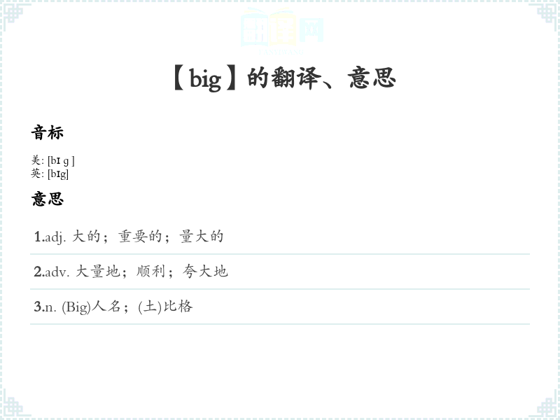 - 音标记忆法:记住“big”的音标/ bɪɡ /,联想为“比格”的发音,想象一个大狗比格犬(Beagle)。