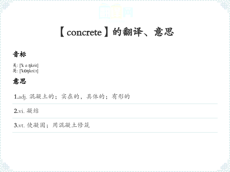 - 定义:作为形容词时,它指的是某事物是具体的、明确的,或者是可以感知的;作为名词时,它指的是一种建筑材料,通常由水泥、沙子、石子和水混合而成,用于建造结构。