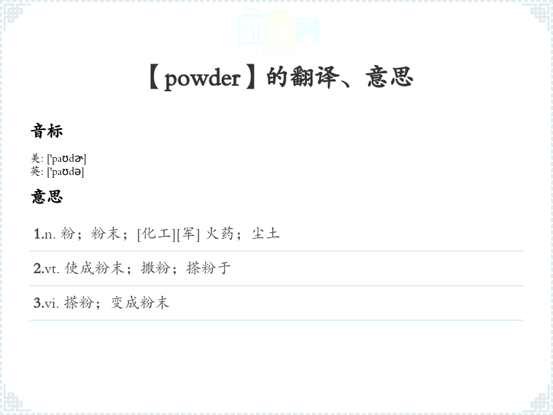 - 在牛津和美国的教材中,powder常用于描述化学反应或烹饪技巧,一般出现在初中或高中阶段。