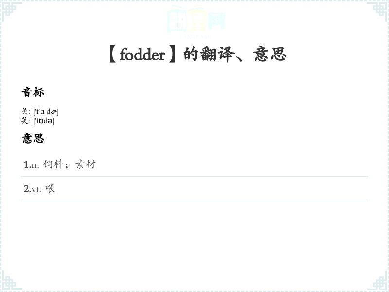 - 字面意思:Fodder指的是为牲畜提供的食物,特别是干草或谷物。更广义上,可以指某种材料或资源,尤其在比喻意义上。