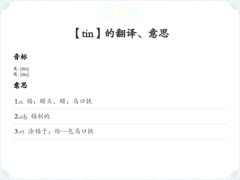 - 字面意思:Tin指的是一种金属元素,符号为Sn,具有银白色光泽,主要用于制造合金和涂层。