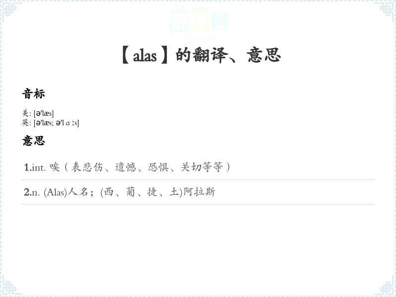 1.int. 唉(表悲伤、遗憾、恐惧、关切等等) 2.n. (Alas)人名;(西、葡、捷、土)阿拉斯