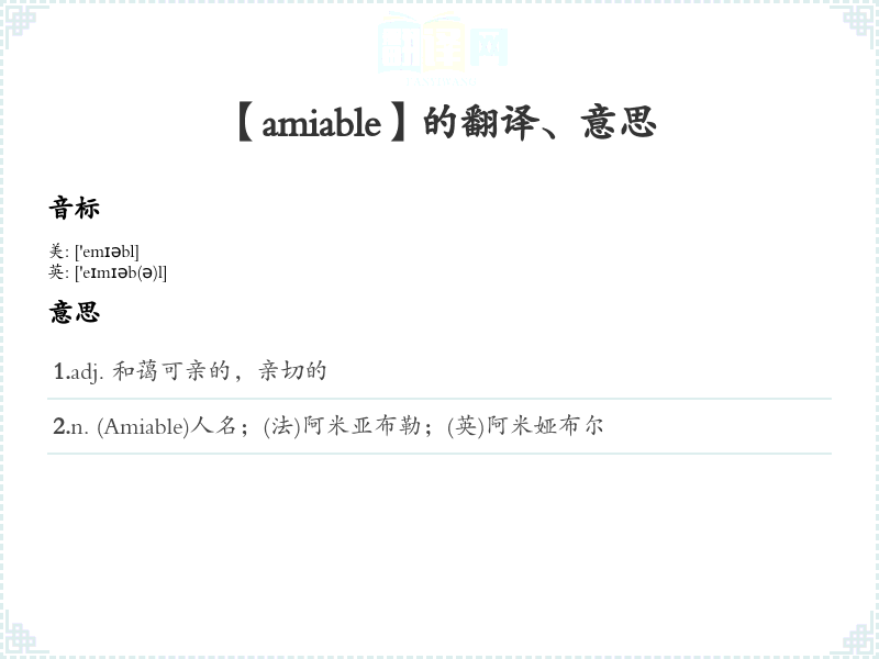 1.adj. 和蔼可亲的,亲切的 2.n. (Amiable)人名;(法)阿米亚布勒;(英)阿米娅布尔