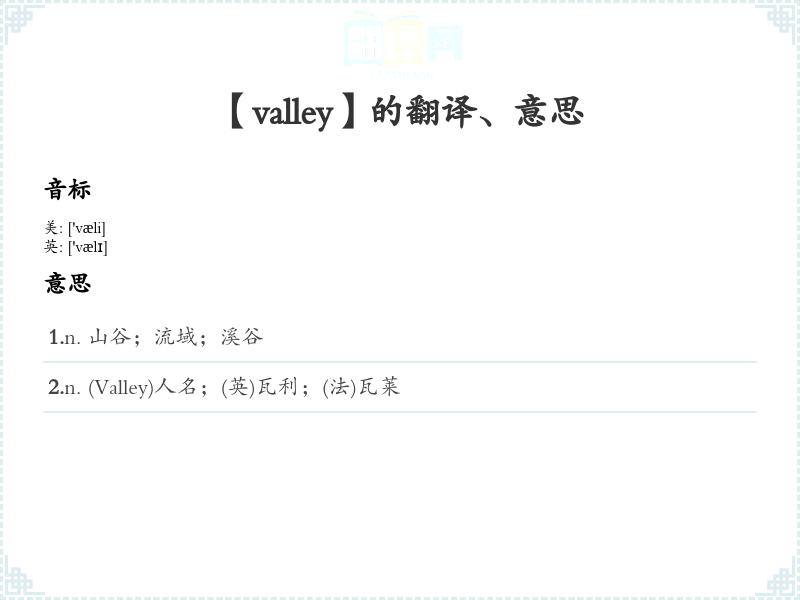 1.n. 山谷;流域;溪谷 2.n. (Valley)人名;(英)瓦利;(法)瓦莱