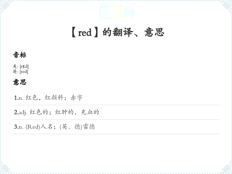 2.adj. 红色的;红肿的,充血的 3.n. (Red)人名;(英、德)雷德