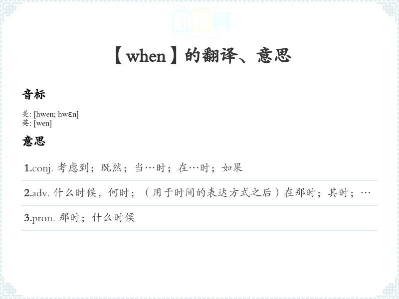 - 4. [CONJ] You use when to introduce a clause where you mention the circumstances under which the event in the main clause happened or will happen. 在…情况下 (引导从句,表示从句中提到的情况是主句中已经发生或即将发生的事的前提)