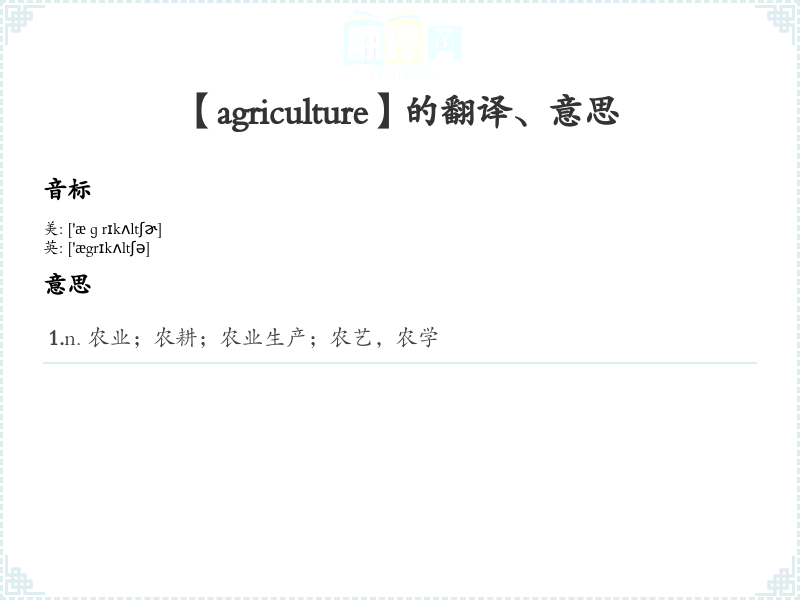 - 1. [N-UNCOUNT] Agriculture is farming and the methods that are used to raise and take care of crops and animals. 农业