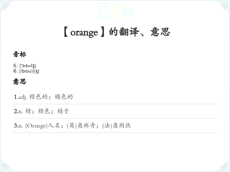 2.n. 橙;橙色;桔子 3.n. (Orange)人名;(英)奥林奇;(法)奥朗热