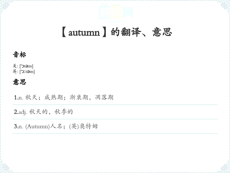 2.adj. 秋天的,秋季的 3.n. (Autumn)人名;(英)奥特姆