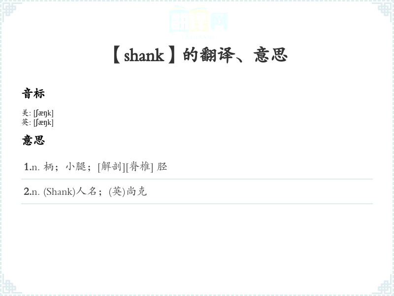 1.n. 柄;小腿;[解剖][脊椎] 胫 2.n. (Shank)人名;(英)尚克