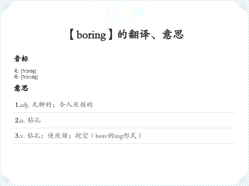 3.v. 钻孔;使厌烦;挖空(bore的ing形式) 4.n. (Boring)人名;(英、瑞典)博林