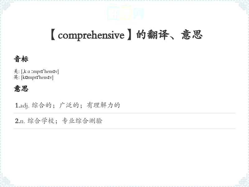 - 通过分析词根“com-”(全部)与“prehendere”(抓住),可以记住“comprehensive”意指能够抓住所有方面的意思。可以把它与“comprehend”(理解)联系起来,理解即是全面理解。
