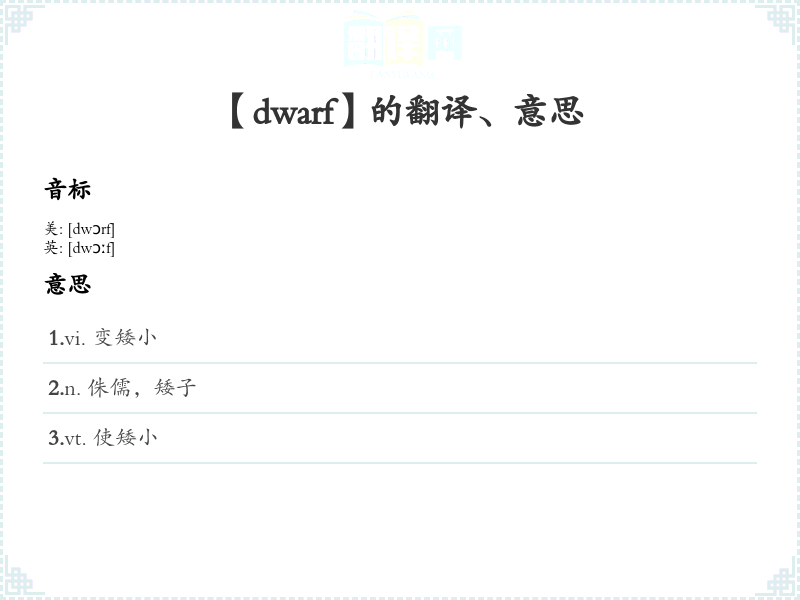 - 词性:名词(dwarf)、动词(to dwarf)、形容词(dwarfish)。