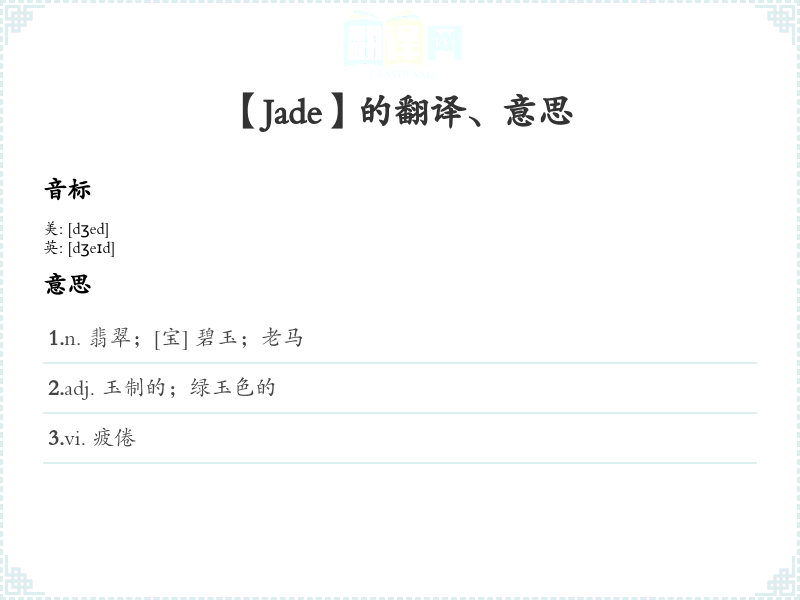 - 字面意思:Jade 是一种绿色或其他颜色的硬玉石,常用于制作珠宝和工艺品。它在不同文化中被视为珍贵的宝石,象征着好运和财富。