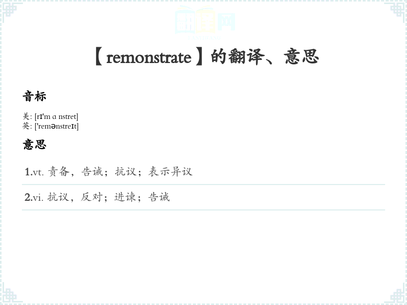 - 谐音联想记忆:可以将“remonstrate”联想为“人们在抗议时再显示(反对)”,帮助记忆。