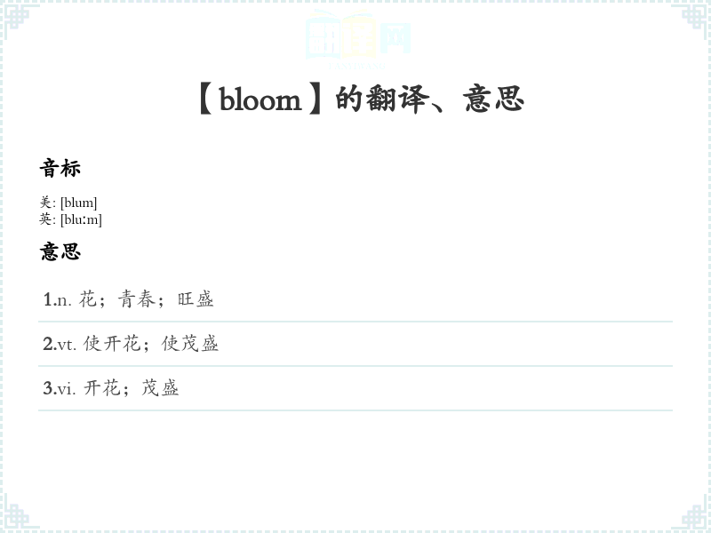 - /bluːm/:可以通过分解音节来记忆,注意“bloom”的发音与“蓝色”(blue)相近,可以联想为“春天的蓝天下,花儿盛开”。