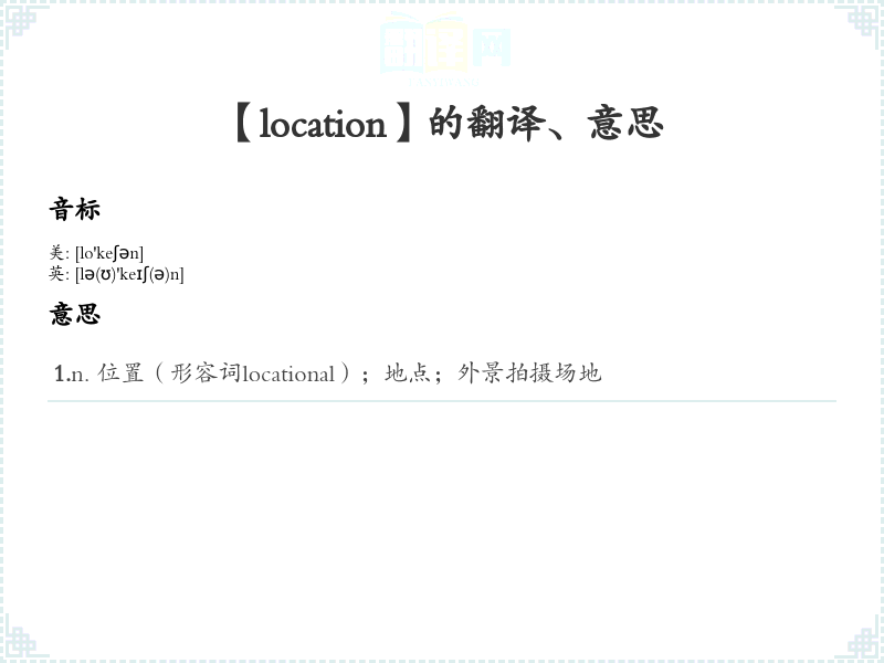 1.n. 位置(形容词locational);地点;外景拍摄场地