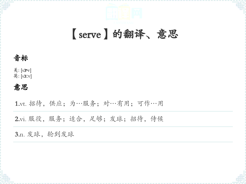 - 字面意思:serve的基本含义是“为某人提供服务或帮助”,可以理解为“提供、服务或满足某种需求”。