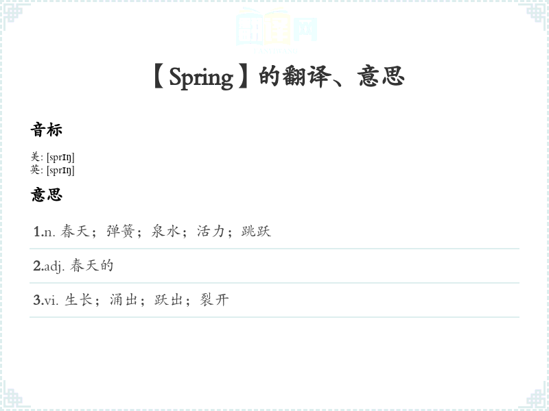 词源分析:Spring 源自古英语“springan”,意思是“跳跃”或“涌出”。其词根与“跳”相关,强调了该词与活力和生长的联系。
