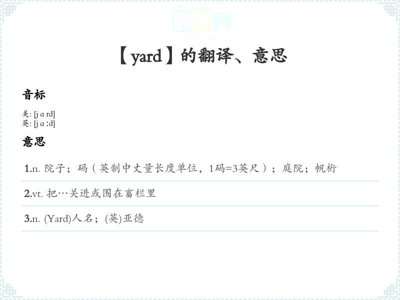 - 字面意思:yard指的是一个单位的长度,等于3英尺(约0.9144米),同时也指某种开放的空间,通常指房屋旁边的院子或场地。