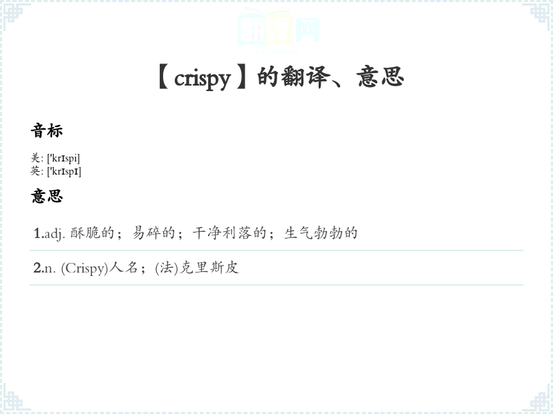 1.adj. 酥脆的;易碎的;干净利落的;生气勃勃的 2.n. (Crispy)人名;(法)克里斯皮