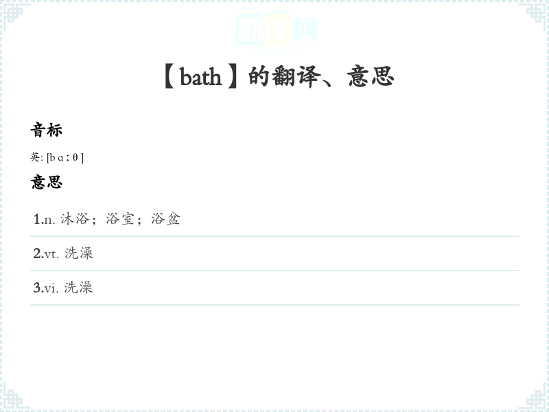 "Bath" 指的是一种用水(通常是热水)洗澡的活动,或是一个专门用于洗澡的设施(如浴缸或浴室)。 - 词性: