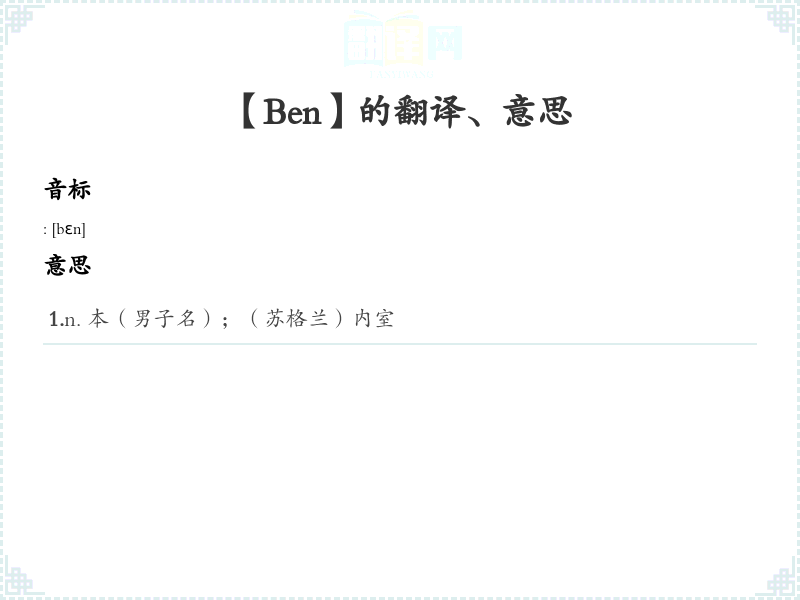 - 字面意思:Ben 是一个常见的名字,通常作为人名使用,尤其是 Benjamin 的简称。字面上,它没有具体的含义,但在某些上下文中可能与“好”或“善良”相关(如在希伯来语中)。