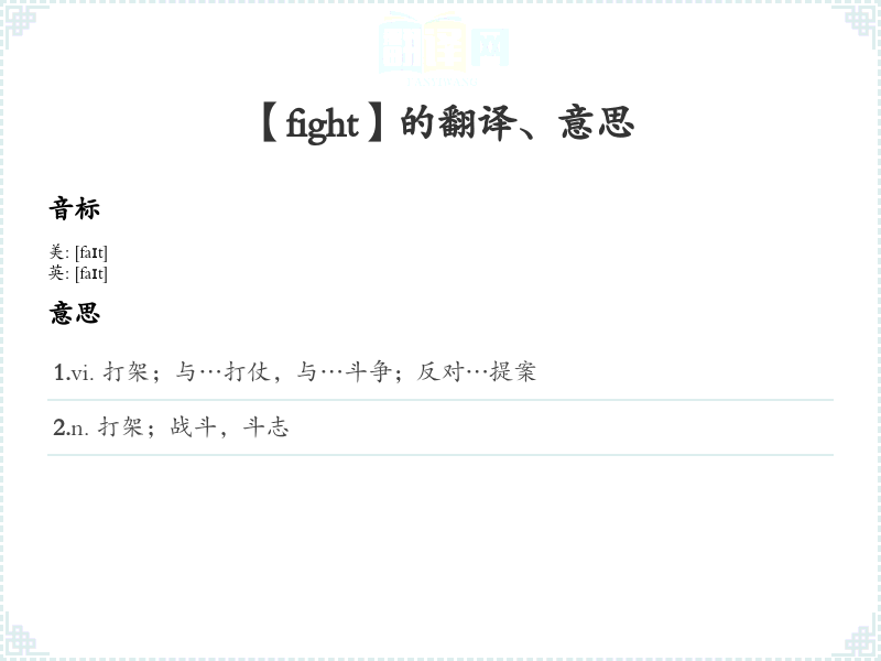 - 字面意思:fight 的字面含义是“打斗”或“争斗”,指的是身体或精神上的对抗。