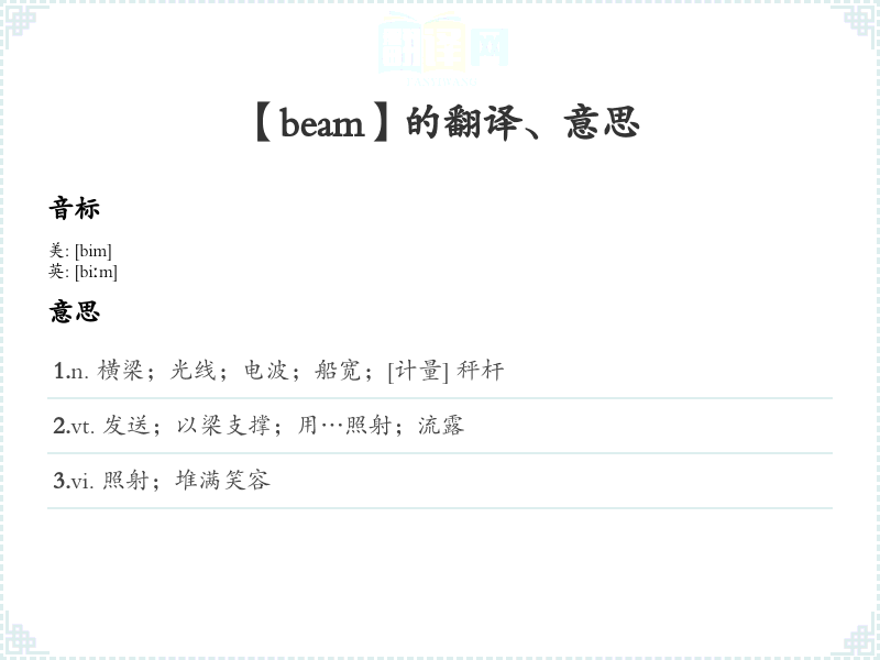 1.n. 横梁;光线;电波;船宽;[计量] 秤杆