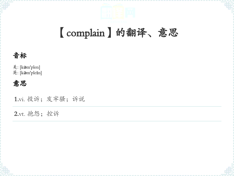 1.vi. 投诉;发牢骚;诉说 2.vt. 抱怨;控诉