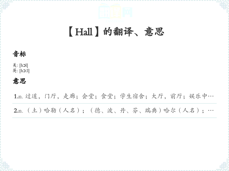 1.n. 过道,门厅,走廊;会堂;食堂;学生宿舍;大厅,前厅;娱乐中心,会所 2.n. (土)哈勒(人名);(德、波、丹、芬、瑞典)哈尔(人名);(英)霍尔(人名);(法)阿尔(人名)