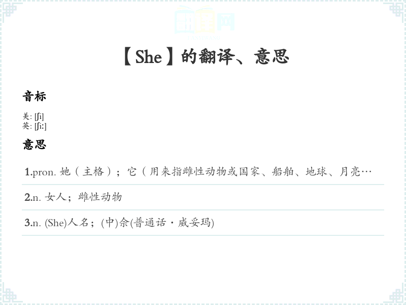 2.n. 女人;雌性动物 3.n. (She)人名;(中)佘(普通话·威妥玛)