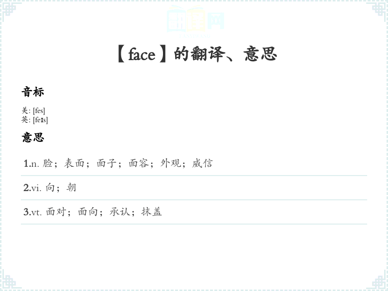 3.vt. 面对;面向;承认;抹盖 4.n. (Face)人名;(法)法斯;(意)法切