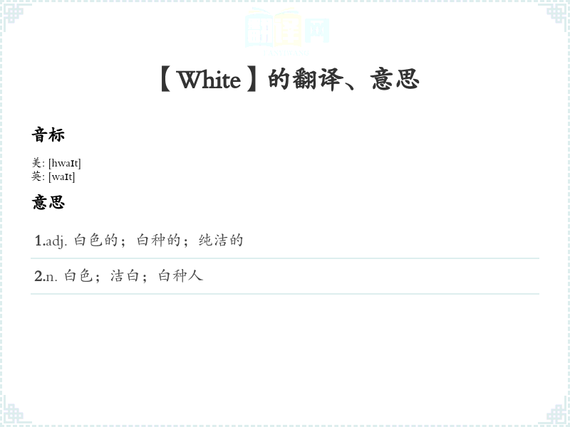 1.adj. 白色的;白种的;纯洁的 2.n. 白色;洁白;白种人