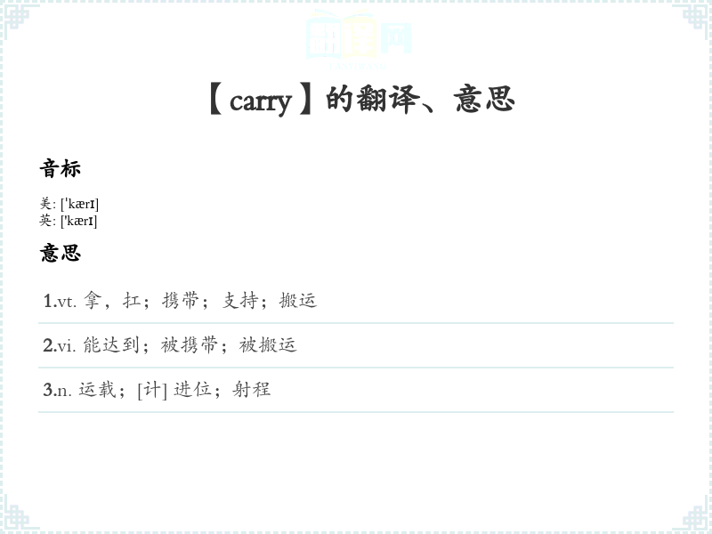词源分析:Carry 源自古法语“carier”,意为“运输”,而该词又源于拉丁语“carriare”,意思是“用车运输”。“Carrus”是拉丁语中“车”的意思。