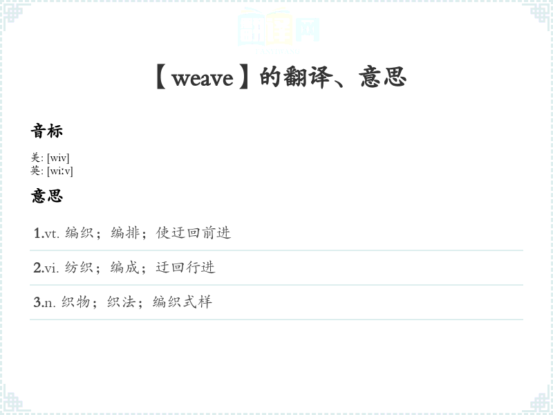 - 字面意思:Weave的字面意思是将纤维交错编织在一起,形成布料或其他材料。清晰定义为“通过交错或编织的方式将纤维、线等构成一种物体”。