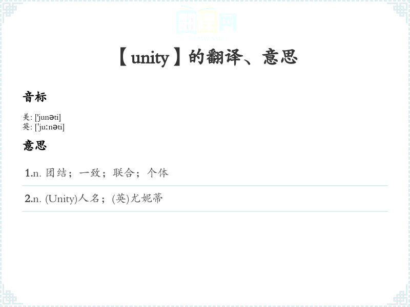 1.n. 团结;一致;联合;个体 2.n. (Unity)人名;(英)尤妮蒂