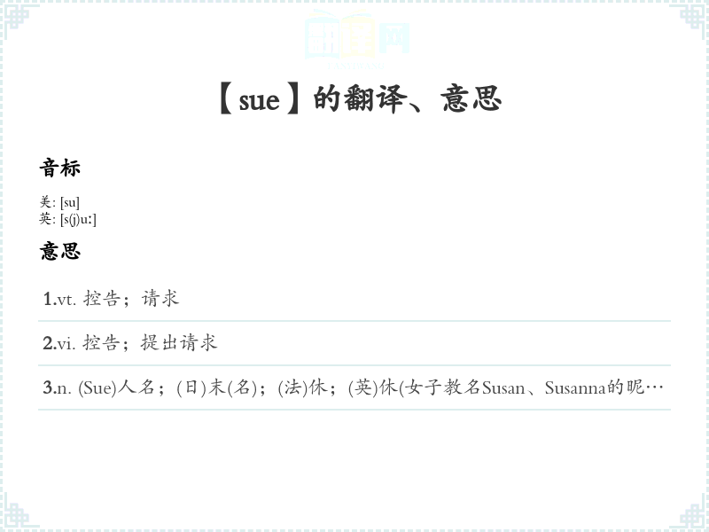 2.vi. 控告;提出请求 3.n. (Sue)人名;(日)末(名);(法)休;(英)休(女子教名Susan、Susanna的昵称)