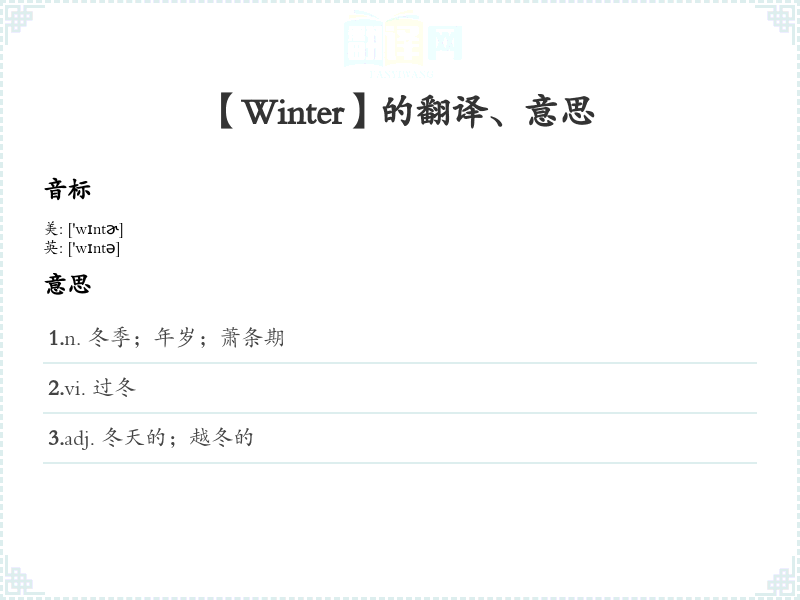 3.adj. 冬天的;越冬的 4.n. (Winter)人名;(英、德、匈、罗、捷、西、芬、瑞典、法)温特