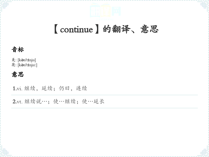 1.vi. 继续,延续;仍旧,连续 2.vt. 继续说…;使…继续;使…延长