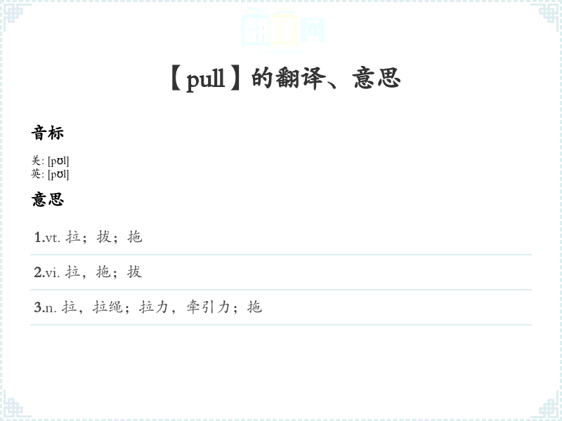 - 字面意思:字面上,“pull”指的是用力向某个方向拉的动作。定义为“用力量使某物靠近自己或向某个方向移动”。