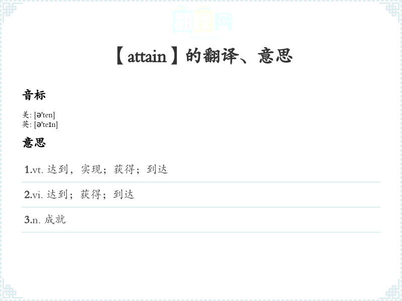 attain的字面含义是“达到”或“获得”。它指的是通过努力或过程来实现某个目标或状态的动作。 - 词性:动词