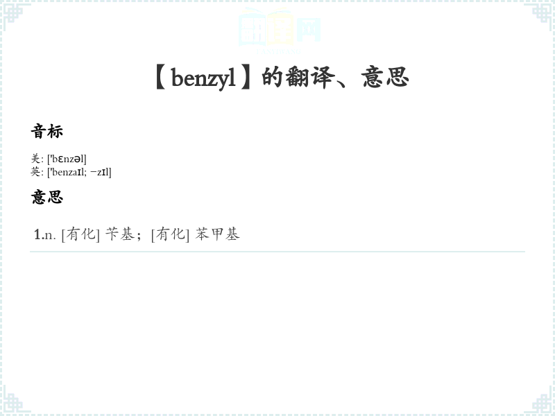 - 1. [N] of, consisting of, or containing the monovalent group C6H5CH2– 苯甲基 (Systematic name phenylmethyl)