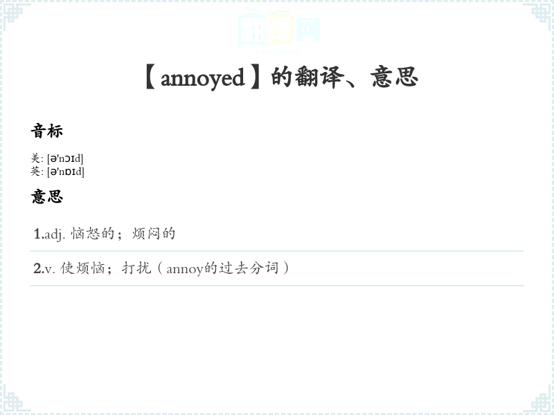 1.adj. 恼怒的;烦闷的 2.v. 使烦恼;打扰(annoy的过去分词)