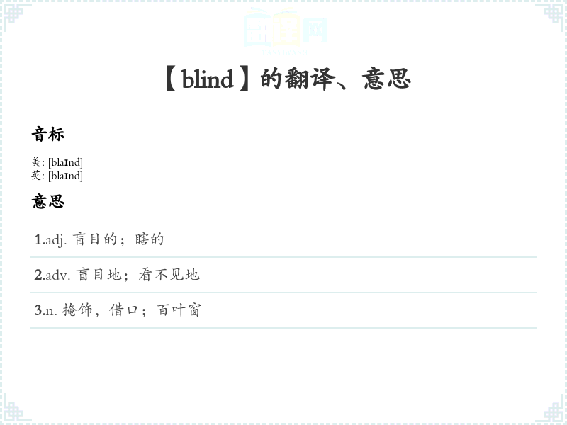 4.vt. 使失明;使失去理智 5.n. (Blind)人名;(法)布兰;(德、瑞典)布林德