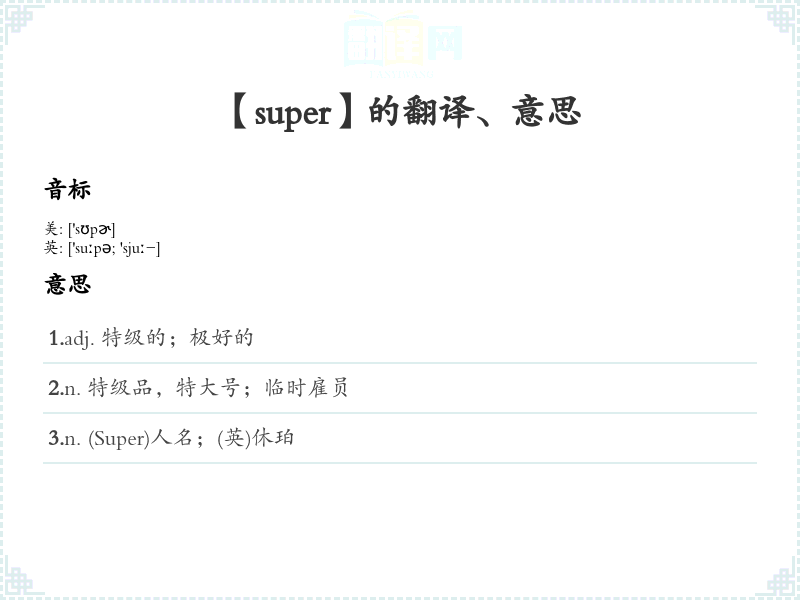 - 字面意思:字面上,“super”表示“超越、超过、极好的”。它通常用于形容某事物的卓越、优秀或强大。