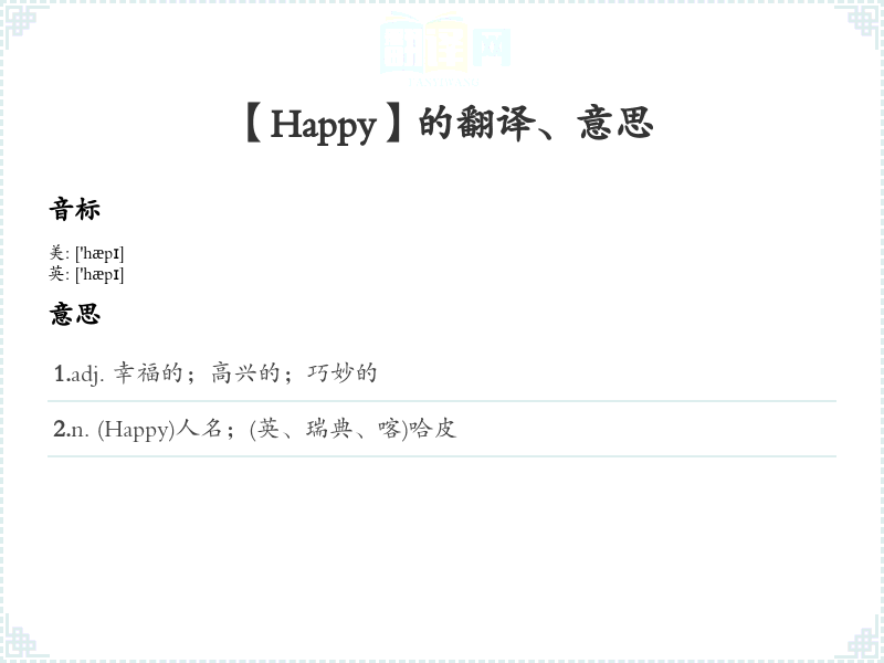 1.adj. 幸福的;高兴的;巧妙的 2.n. (Happy)人名;(英、瑞典、喀)哈皮